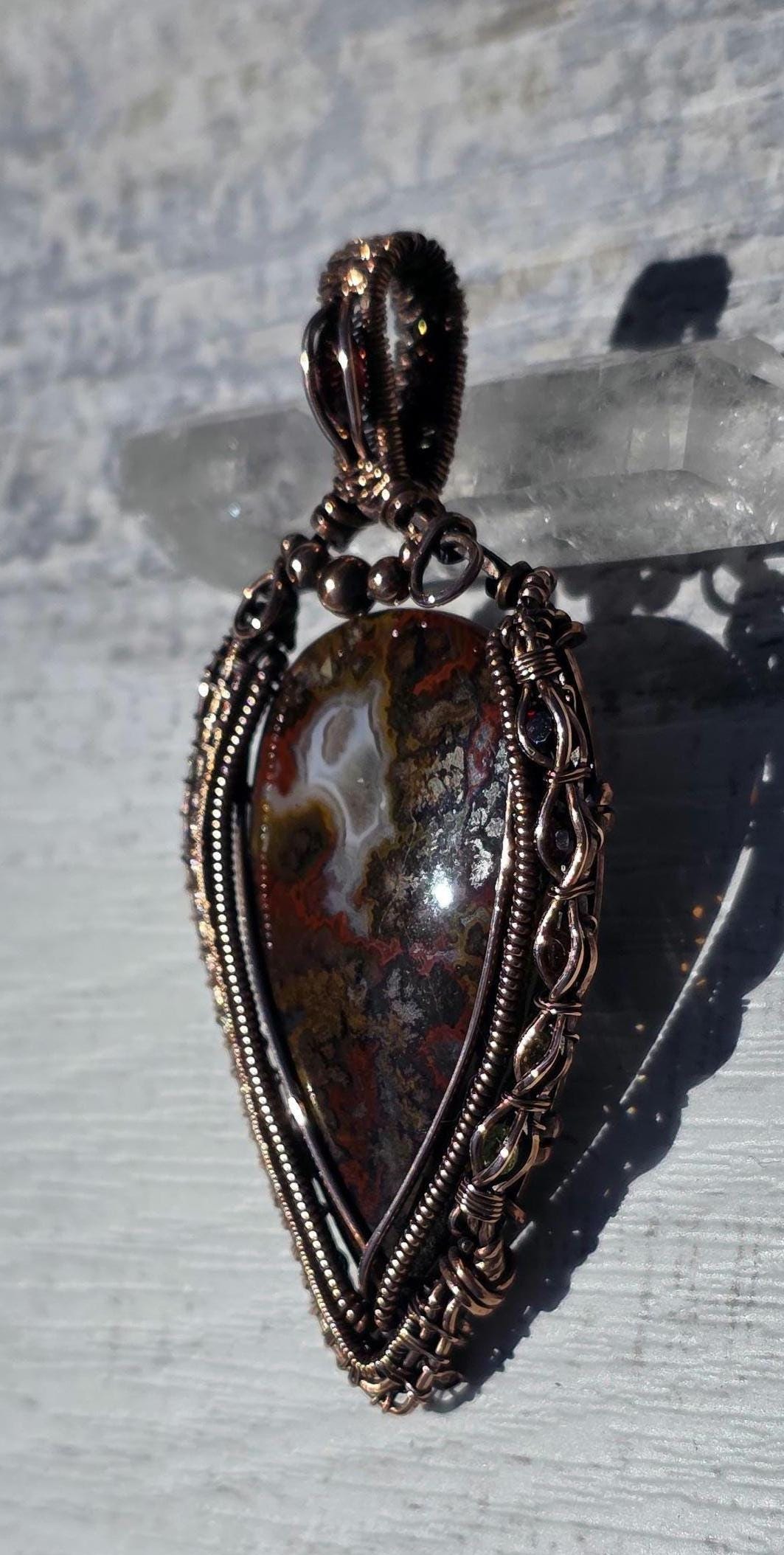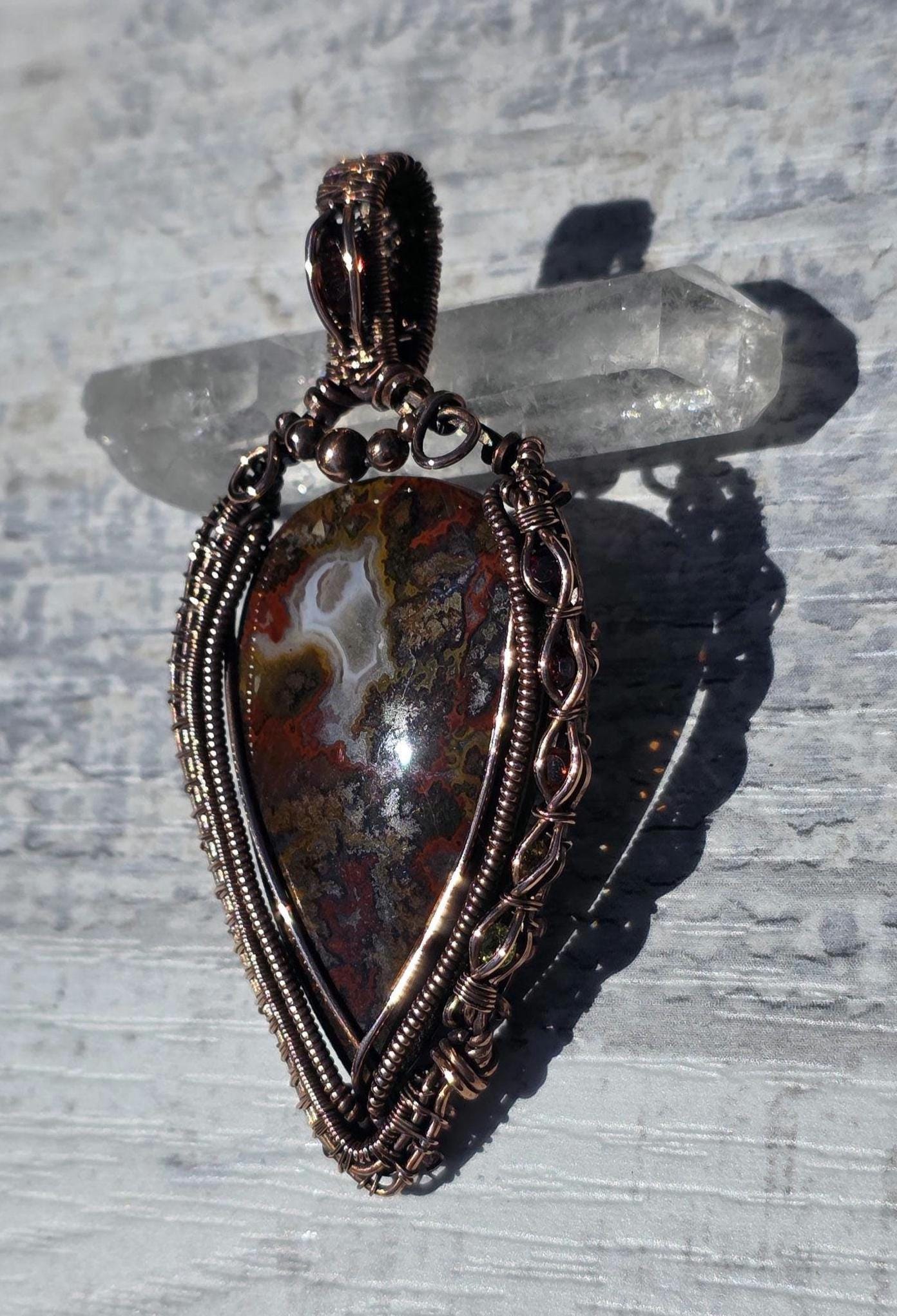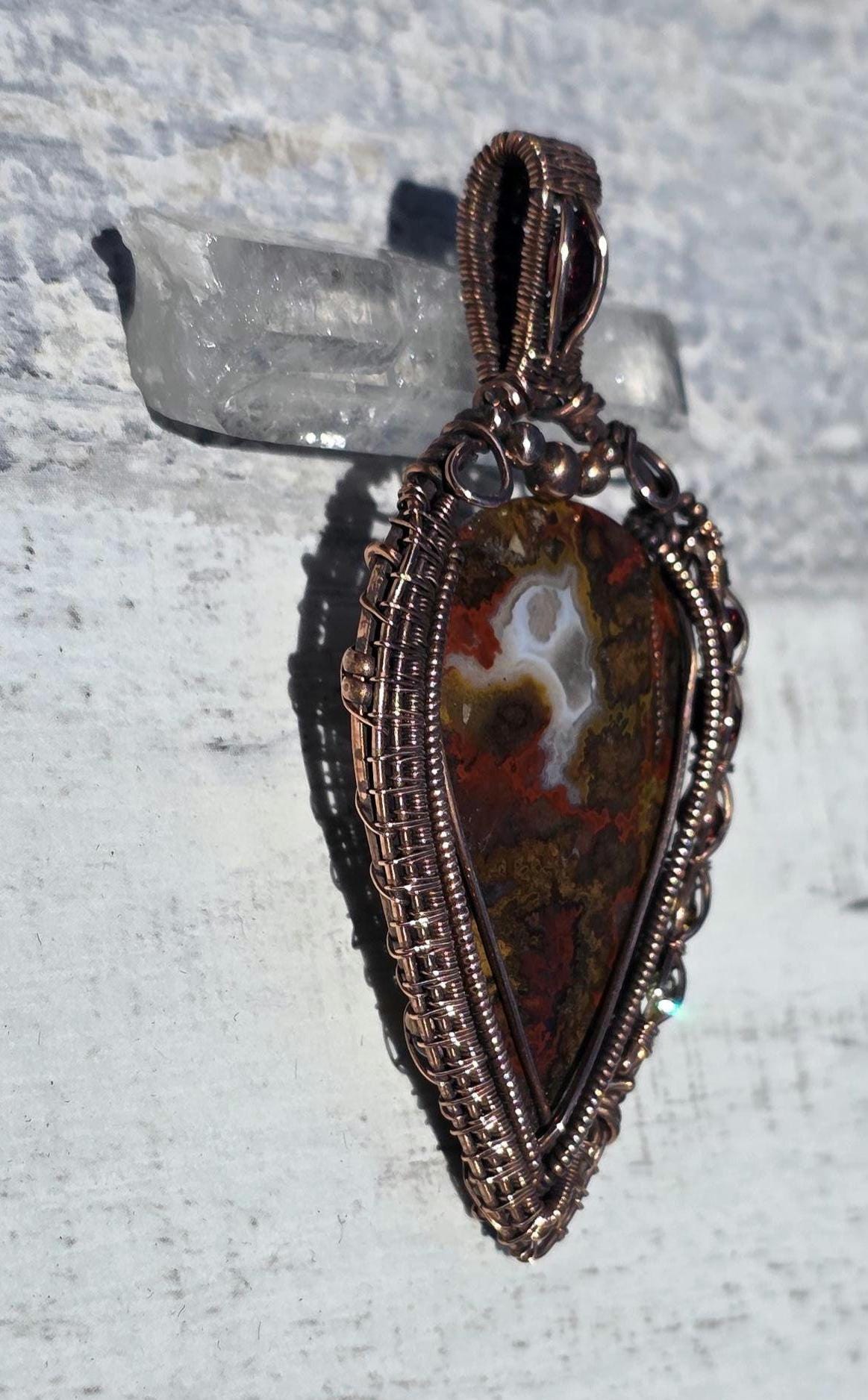 A stunning Plume agate accented with multiple Garnets, Citrine and Peridot. Wrapped in spun copper and hand polished.