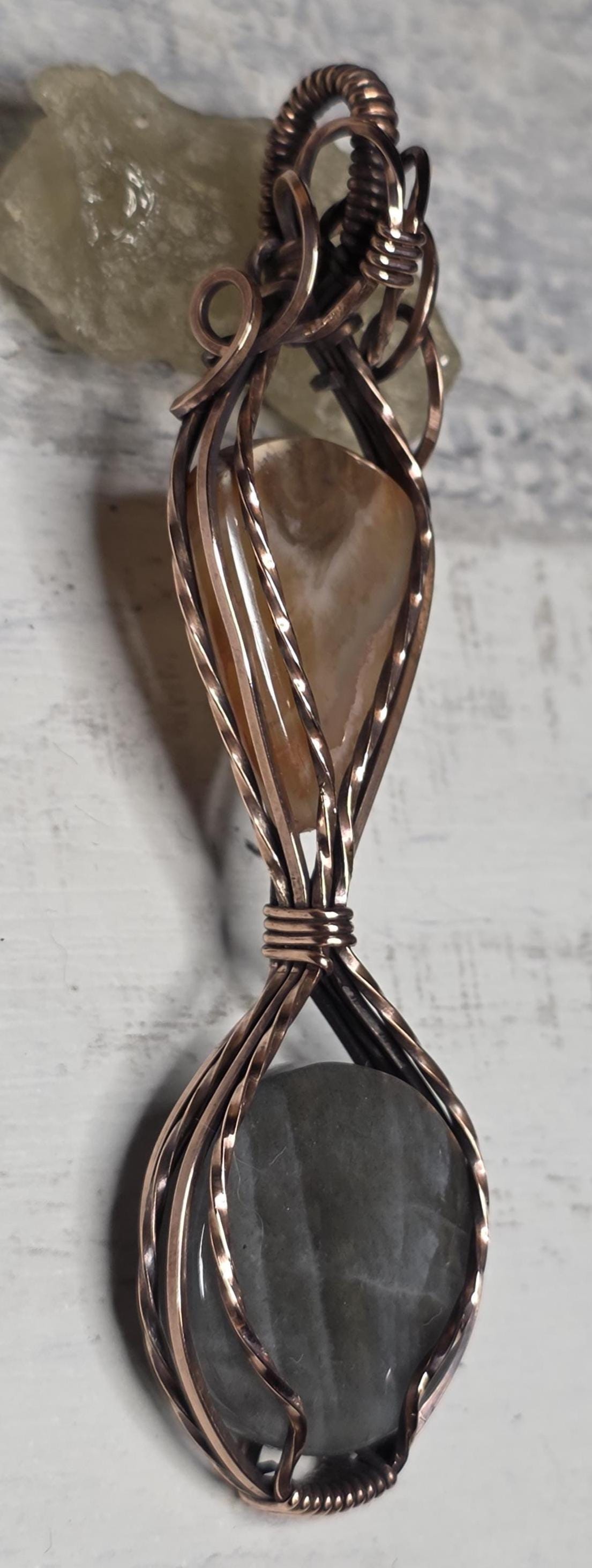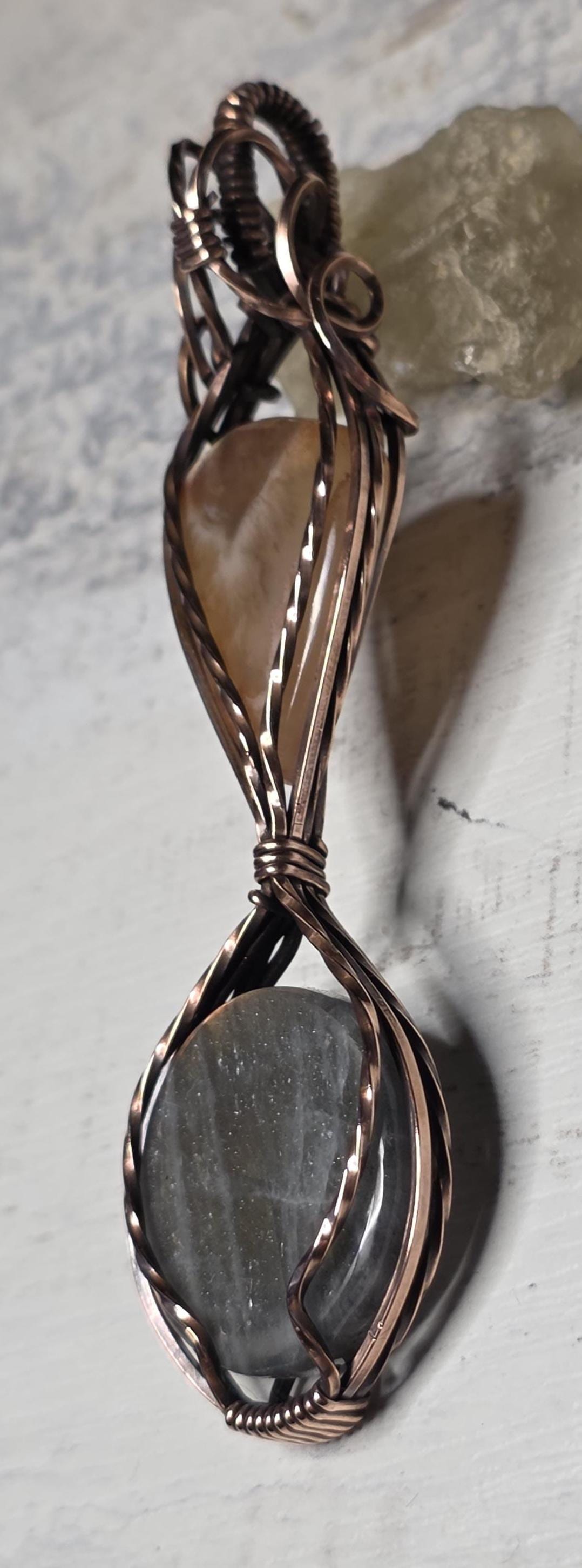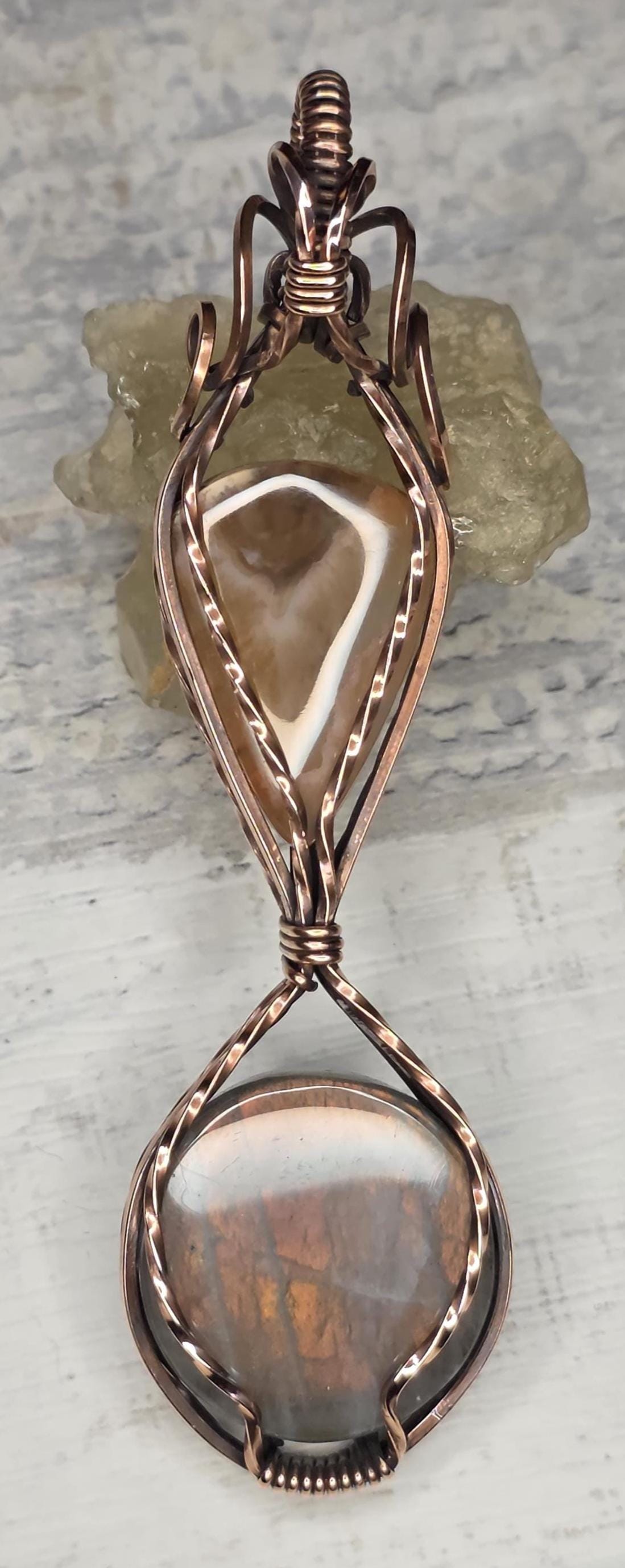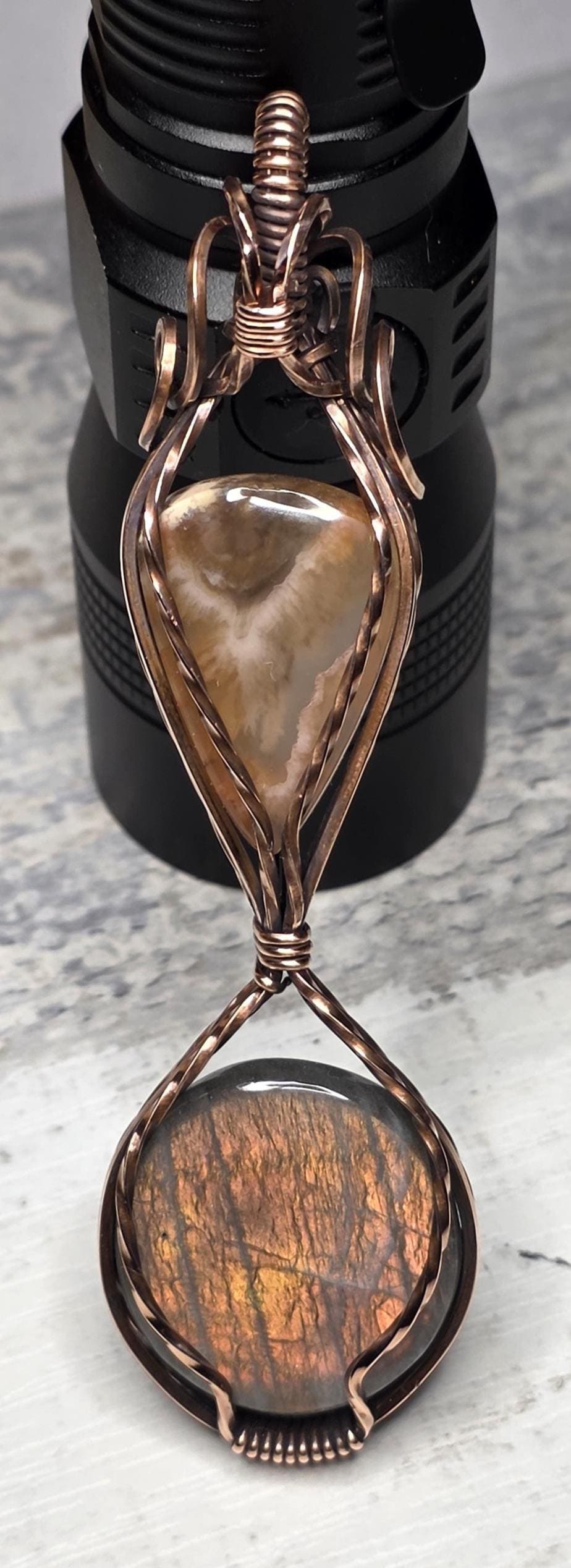 An orange flash Labradorite and an Andara Plume Agate hand woven and polished in Copper.
