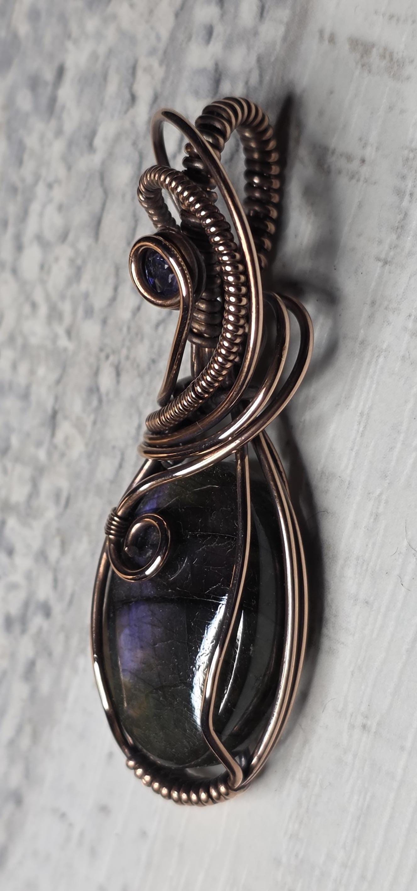 This flashy purple Labradorite is accented with a faceted Iolite facet. Hand woven and polished in Copper.