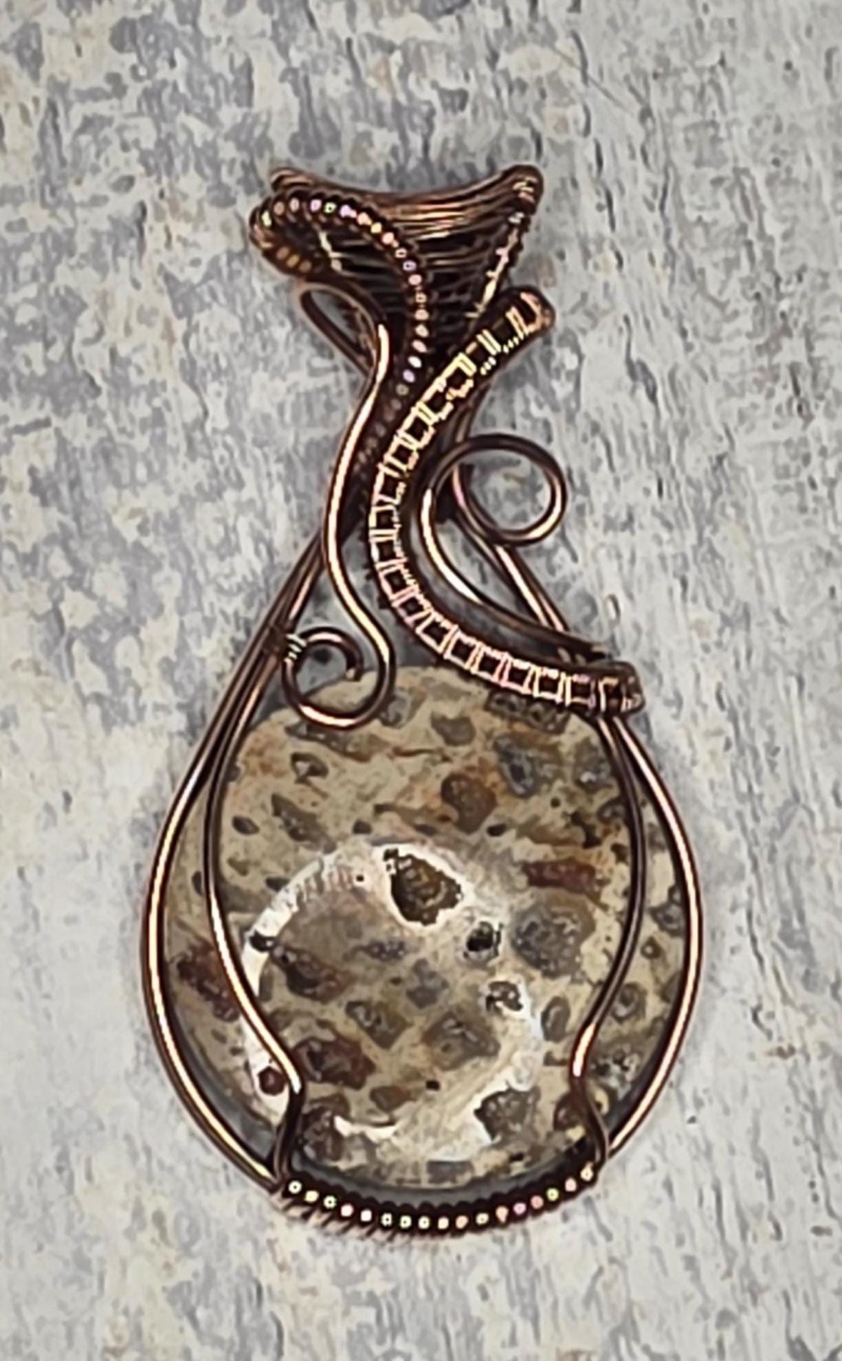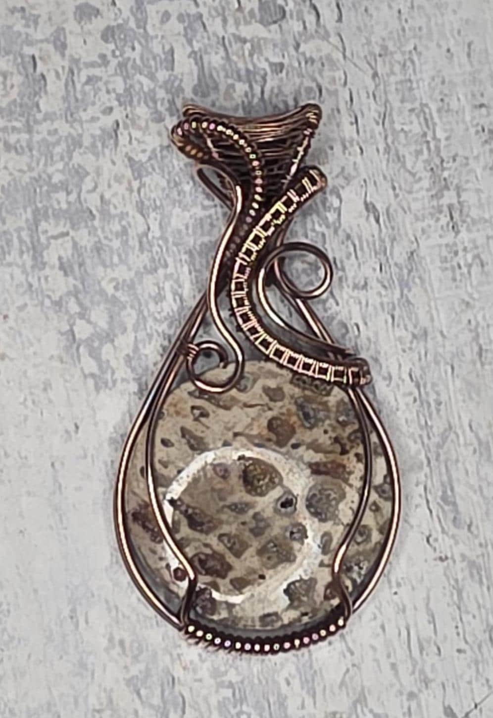 A stunning druzy filled Petrified Wood wrapped in spun copper and hand polished.