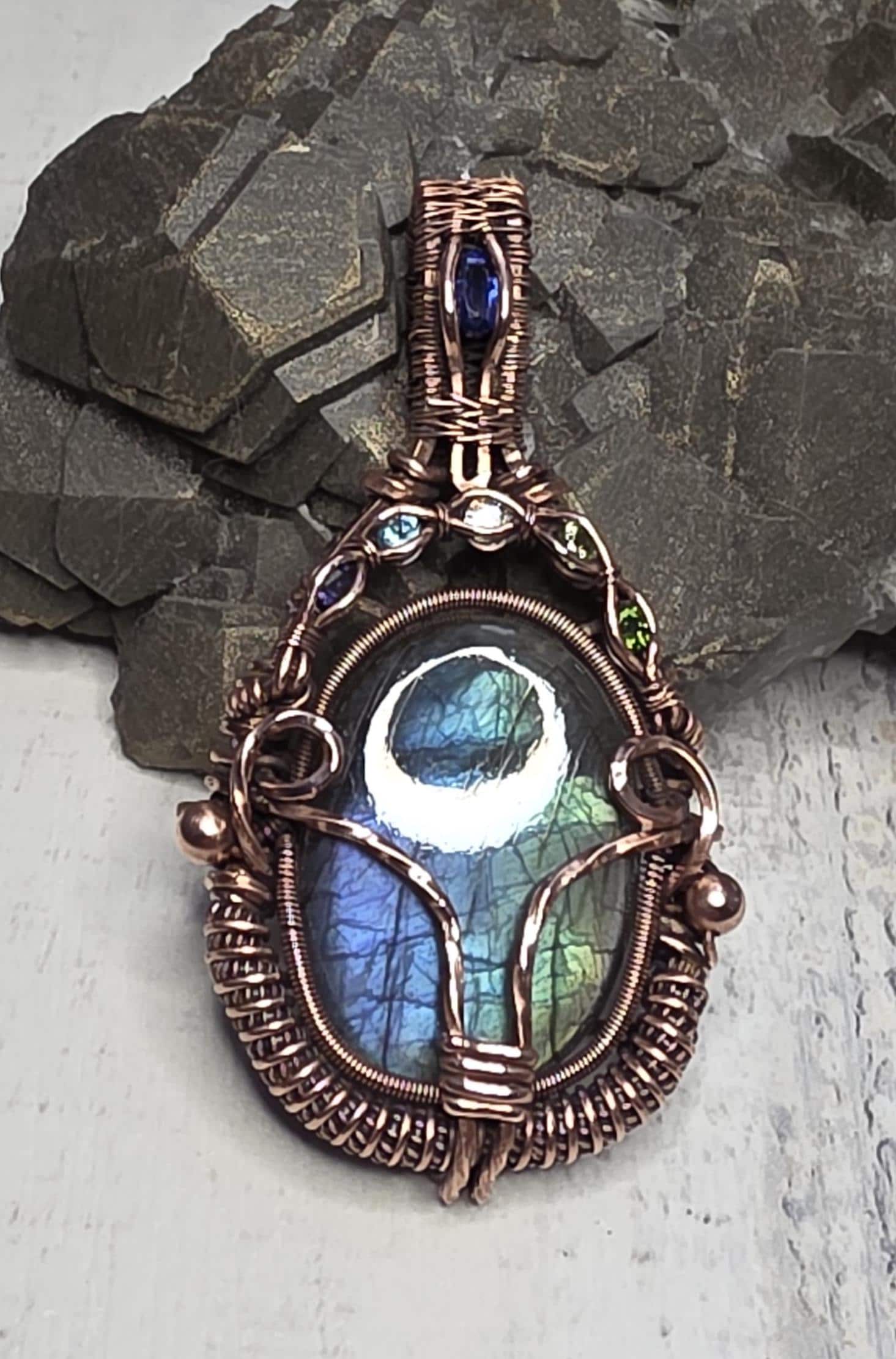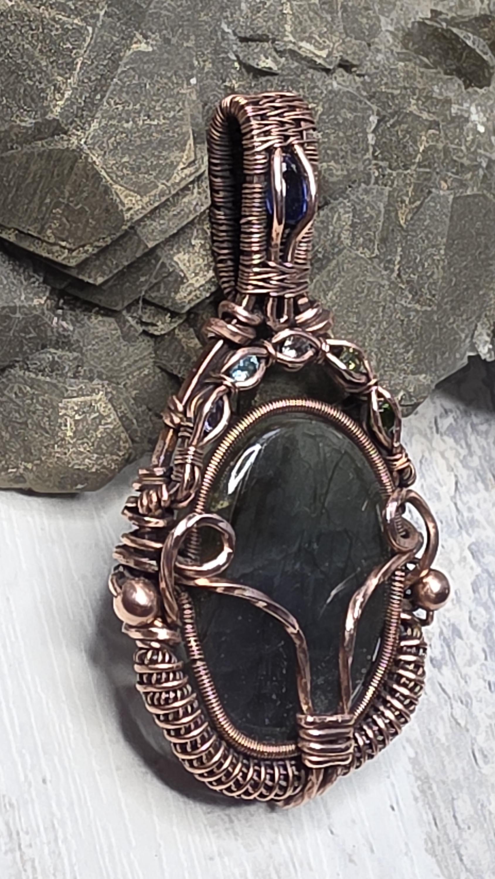 A Blue and Green Flash Labradorite accented wit Amethyst, Blue Apatite, White Topaz, Peridot and Chrome Diopside, with a deep blue Kyanite in the bail.